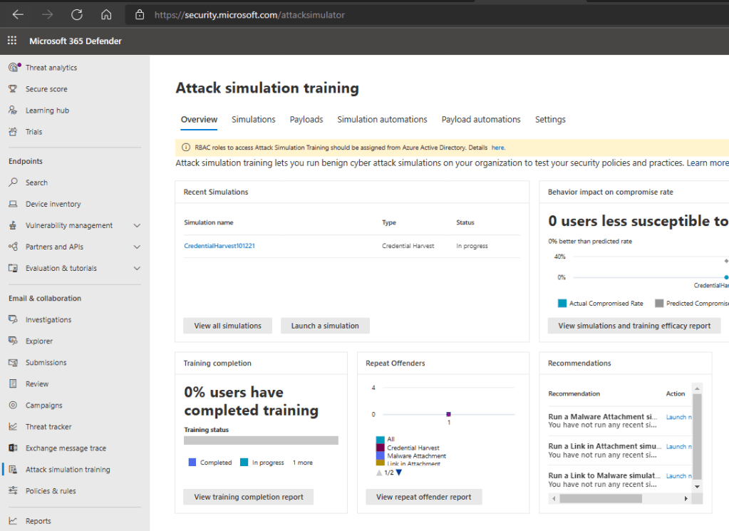 - Open the M365 Security and Compliance centre and select ‘Attack Simulation Training’ from the left hand pane under ‘Email and collaboration’