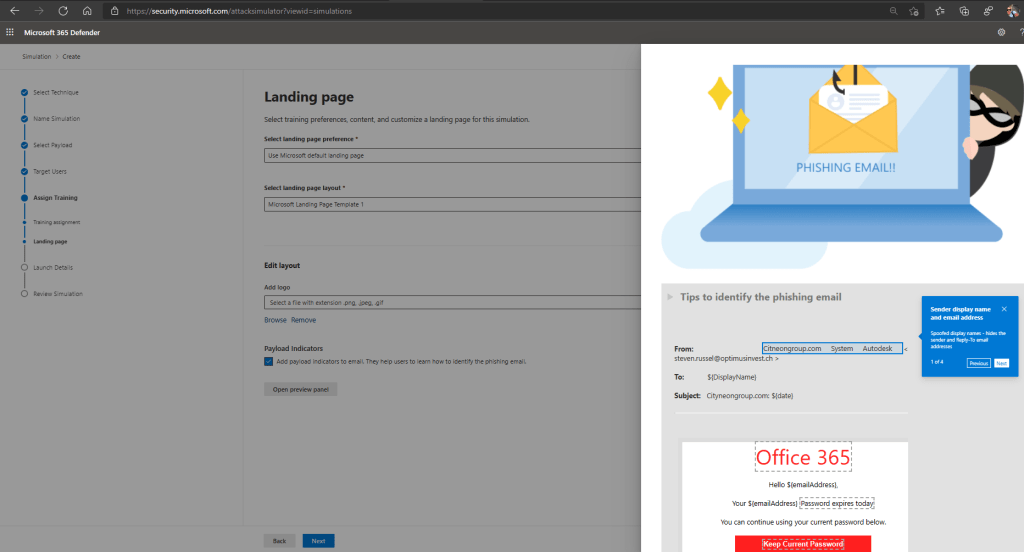 - Choose 1 of the templated payloads, or create a custom payload. Customisation includes adding themes, sender addresses, industry type, email template and so on. Select the template to see a preview on the right hand side. Once chosen, select ‘Next’