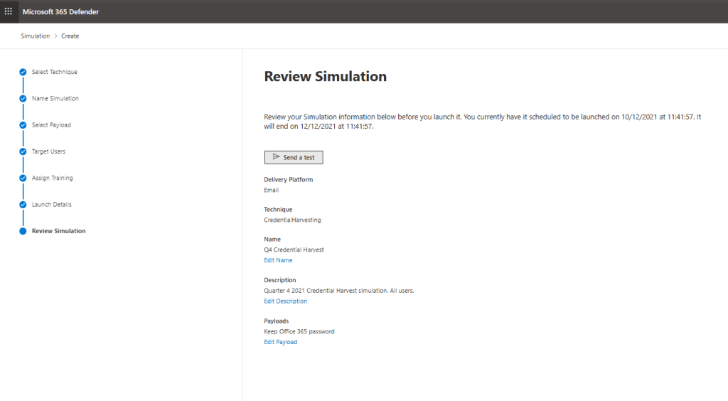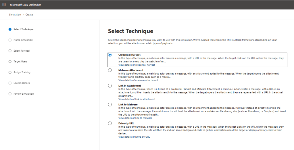 For the example, I will be scheduling a Credential Harvest simulation to all users within the organisation.
