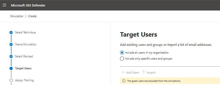 - Scope the simulation by selecting either specific users and groups or all users in the organisation. Select ‘Next’ to continue