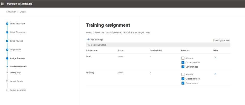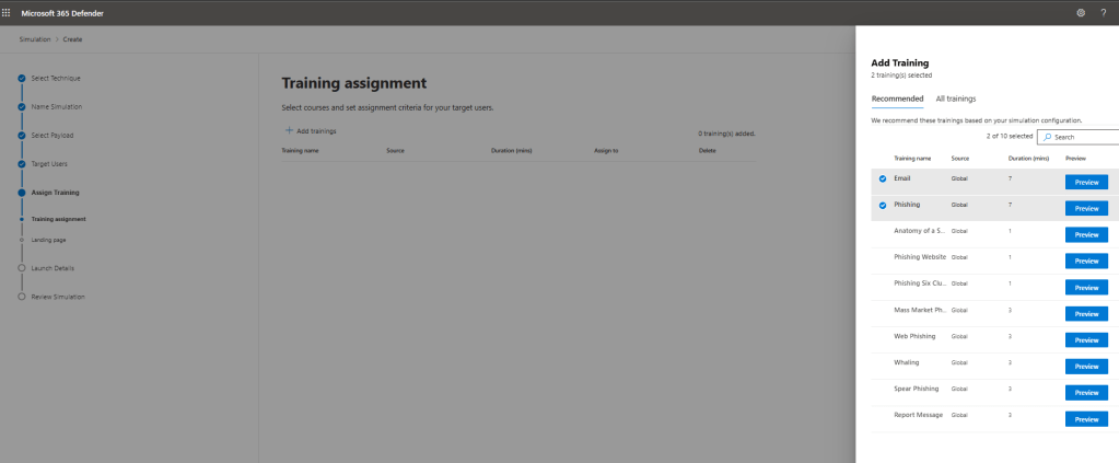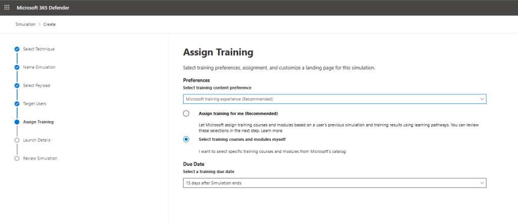 - In the ‘Assign Training’ section, you can choose whether to let Microsoft automatically send training material post simulation to users, explicitly decide which training users get, or provide no subsequent training. If selected, relevant training material will be distributed to scoped users post simulation to help them better understand the dangers of these types of attack and educate them for better handling future events.