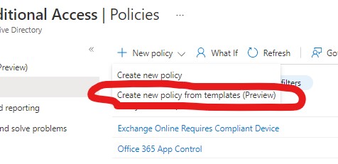 Select the ‘New Policy’ drop down and ‘Create new policy from templates (preview)’ –