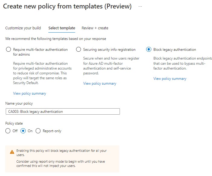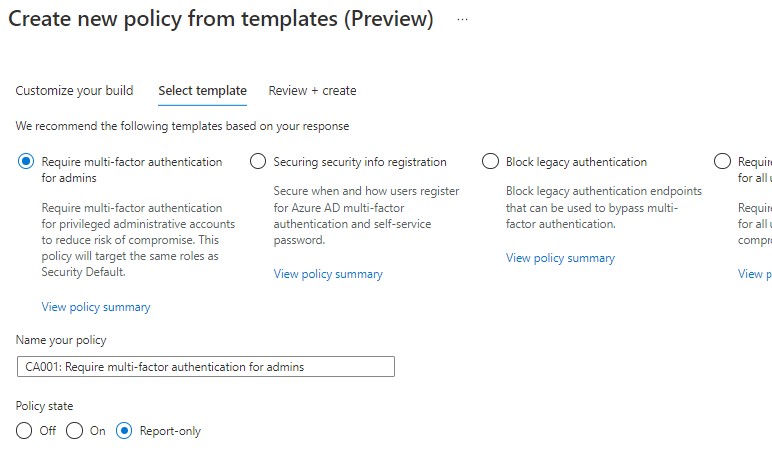 The templates themselves include a summary for what the policy would do and helpful tips for each template providing a notification of the possible implications and recommendations for each. For example, the following tip is shown when selecting the ‘Require multi-factor authentication for admins’ template