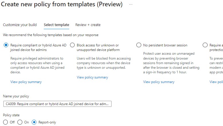 Policy Templates are currently in Preview, and offer a set of 8 identity driven templates –
