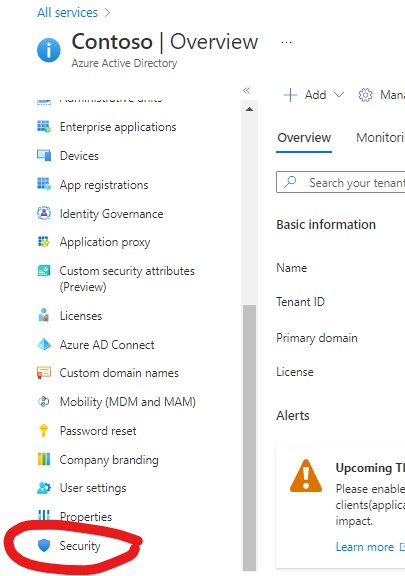 From the Azure Active Directory portal, select ‘Security’ from the left hand pane –