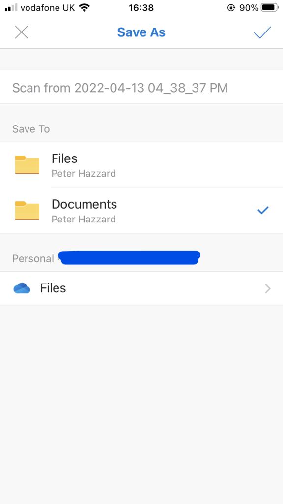 Select the OneDrive destination folder to save the file, rename as necessary and select the tick icon in the top right to save the file