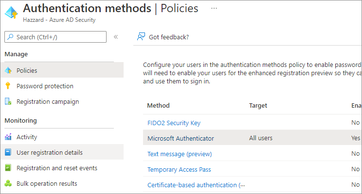 - Navigate to ‘Authentication methods’ in Azure AD under the ‘Security’ section
